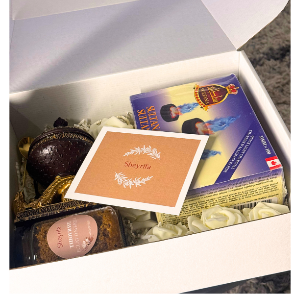 La box Saramaya est composée d’un encensoir, d’un grand thiouraye, de charbon, d’une cuillère à thiouraye et d’une pince à charbon.